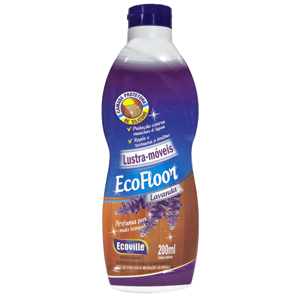 Lustra móveis Ecofloor repõe e restaura o brilho dos móveis, deixando uma camada protetora de silicone que protege a superfície contra manchas d’água e poeira. Perfume duraduro de lavanda. Embalagem 200ml